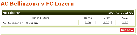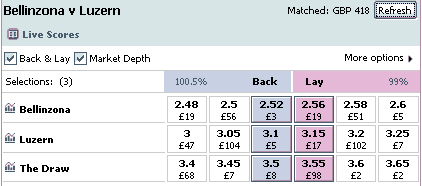 For the qualifying bet you look for an event where the BACK and LAY odds are both close and low e.g. BACK odds at 2.0 and LAY odds at 2.1. If you can find LAY odds which are lower than the BACK odds this is good. Always try to find LAY odds lower than the BACK odds because this will lose you less money in the qualifying bet (maybe even win some money) – but remember we’re only talking losing pennies here so don’t get too hung up on it. I'm doing a qualifying bet of £10 and I've found a Swiss Super league football match between AC Bellinzona and FC Luzern which I am going to use for my Matched Bet qualifier. The market is the 90 mins Home-Draw-Away (or 1X2). The Bookie I am using is