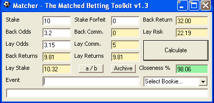 Having found my event I now use the Matcher program to work out the numbers for me. When I put the Stake (£10), BACK odds (3.2) and LAY odds (3.15) into Matcher and click the Calculate button here's what it tells me. Matcher tells me that for the £10 bet at Totesport I must stake £10.32 at Betfair (see the Lay Stake box on the bottom left) and I’ll need £22.19 in my Betfair account to cover the bet (see Lay Risk box on the right-hand-side). It also tells me that I’m sure of getting £9.81 back no matter what the outcome of the match (see the Back Returns and Lay Returns boxes). That’s a loss of 19p - not too bad for the qualifier I think to myself so I decide to use this market for my bets. When the football match finishes I’ve lost 19p but now I have a £10 free bet and here’s what I do.
