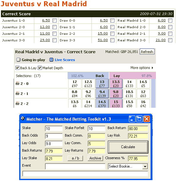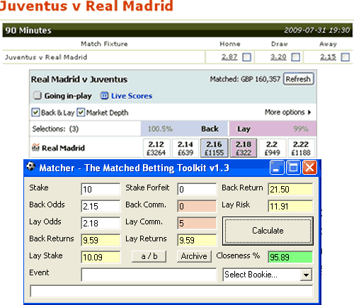 look for an event where the BACK and LAY odds are both close and low The match I have chosen for my free bet is Juventus V Real Madrid. Here are the relevant screen shots. First is the Totesport odds showing Real Madrid to win at 2.15. The Betfair screen next shows I can LAY Real Madrid at 2.18 and there is £322 available for LAY bets (see the amount under the 2.18 LAY odds). Finally the Matcher calculations show I should place a LAY bet of £10.09 which will guarantee me a profit of £9.59. With my 19p loss on the qualifier this leaves me £9.40 in profit! |